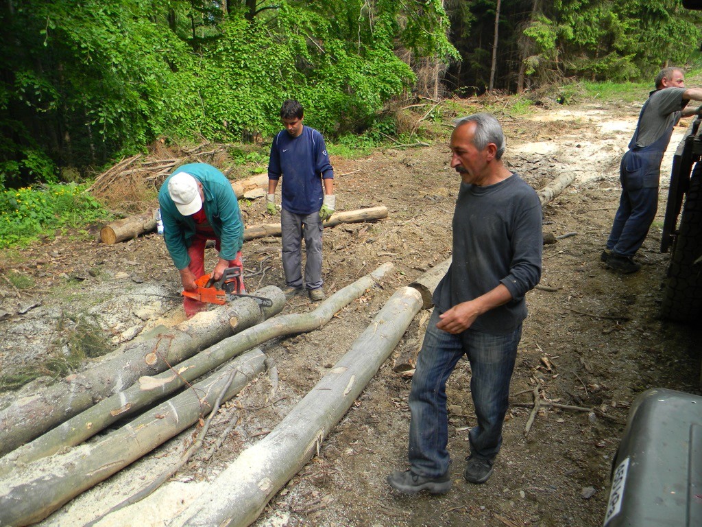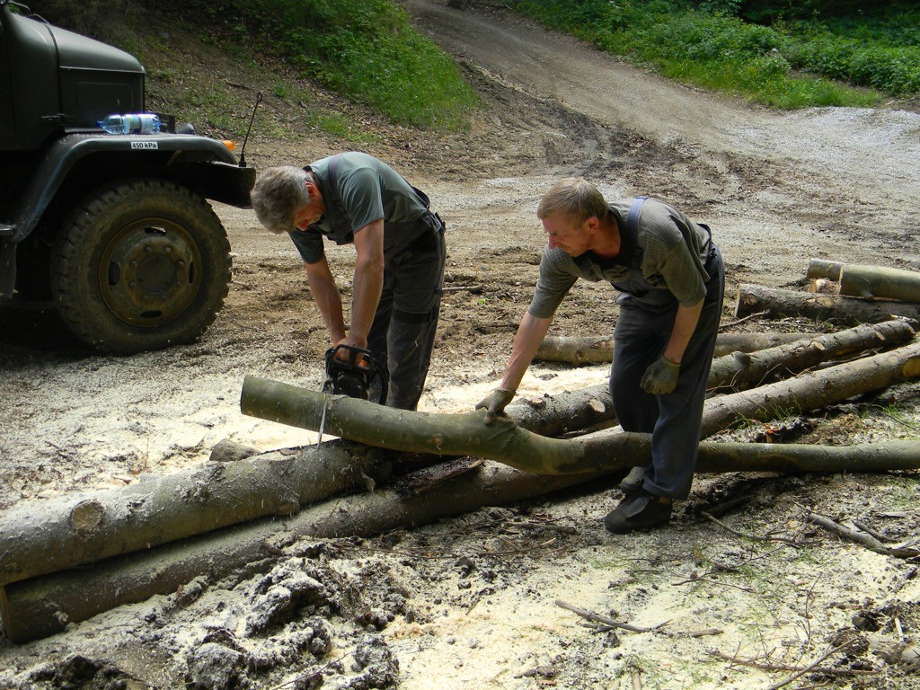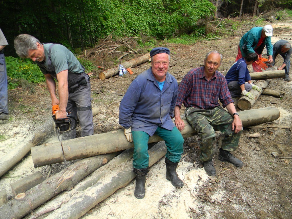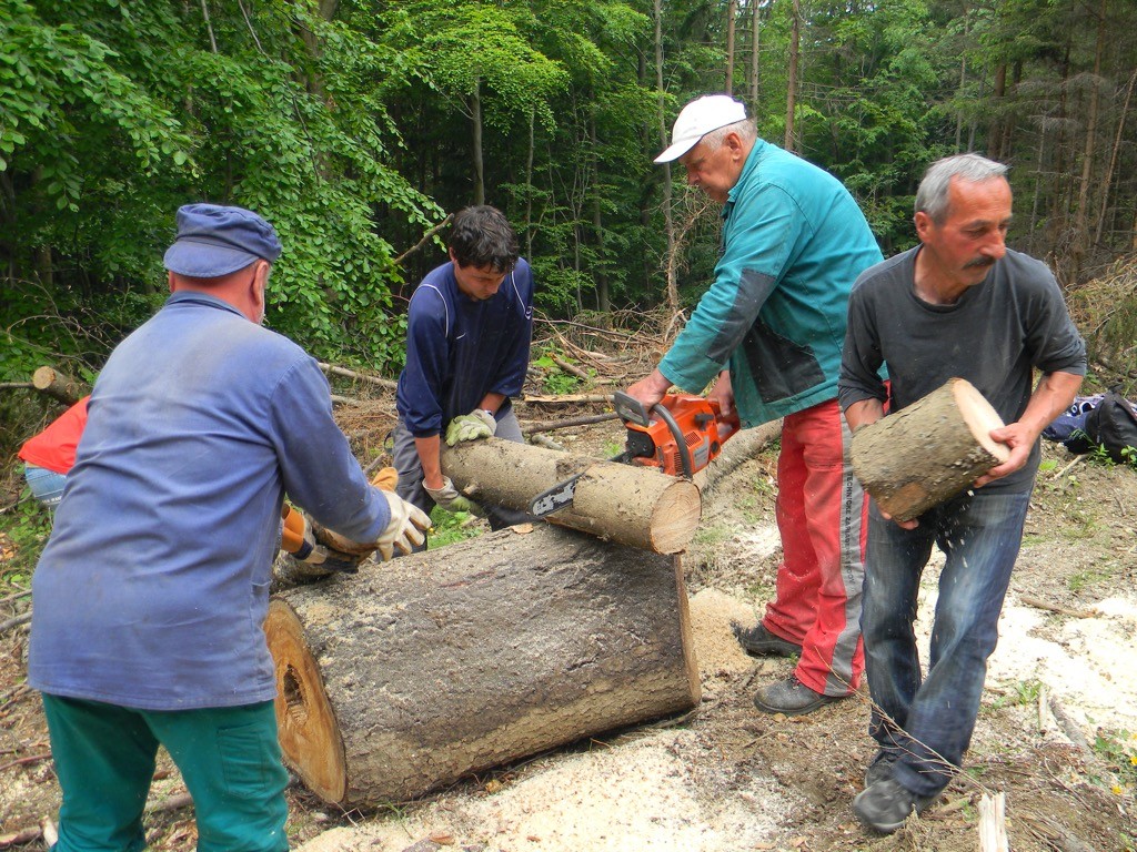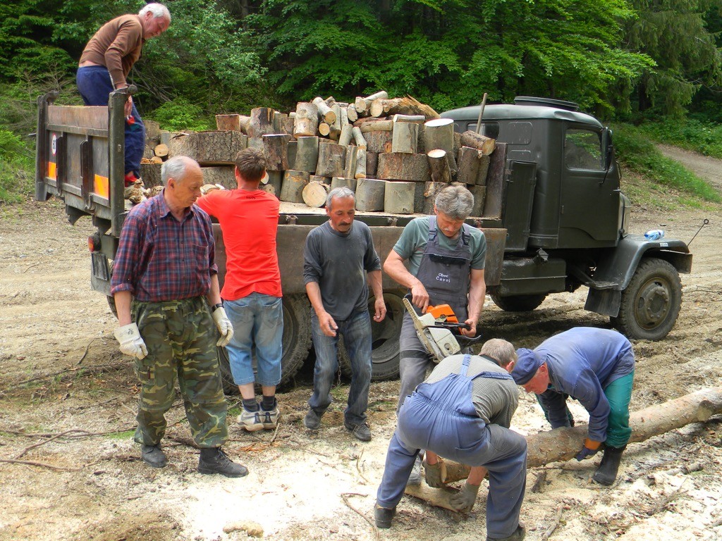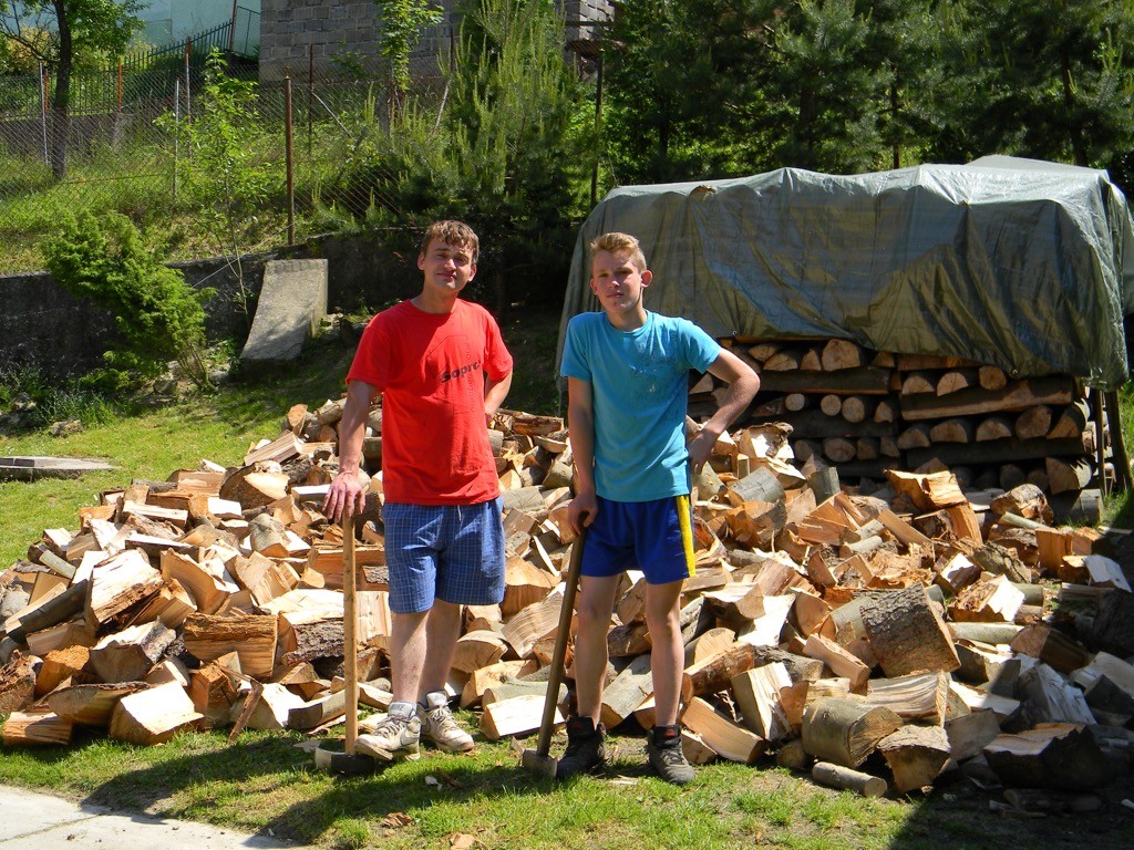 Zvezené drevo bolo treba porúbať. Tejto ťažkej úlohy sa ujali ochotní bratia, Laco a Tonko Noskovi. Pán Boh im zaplať.