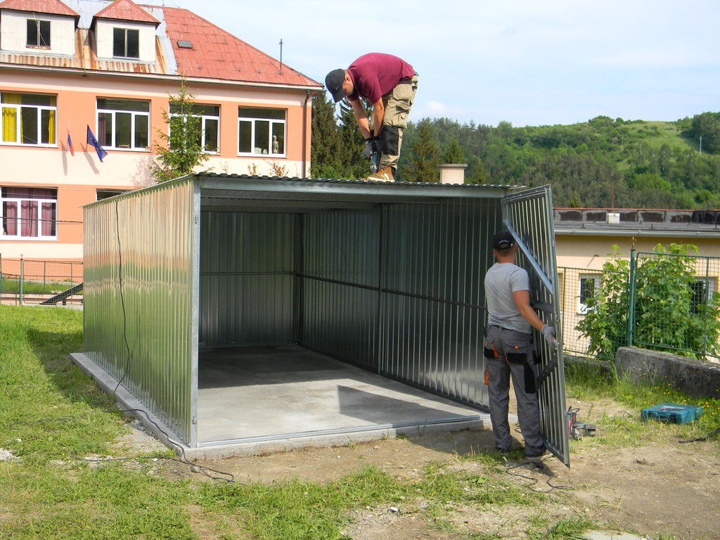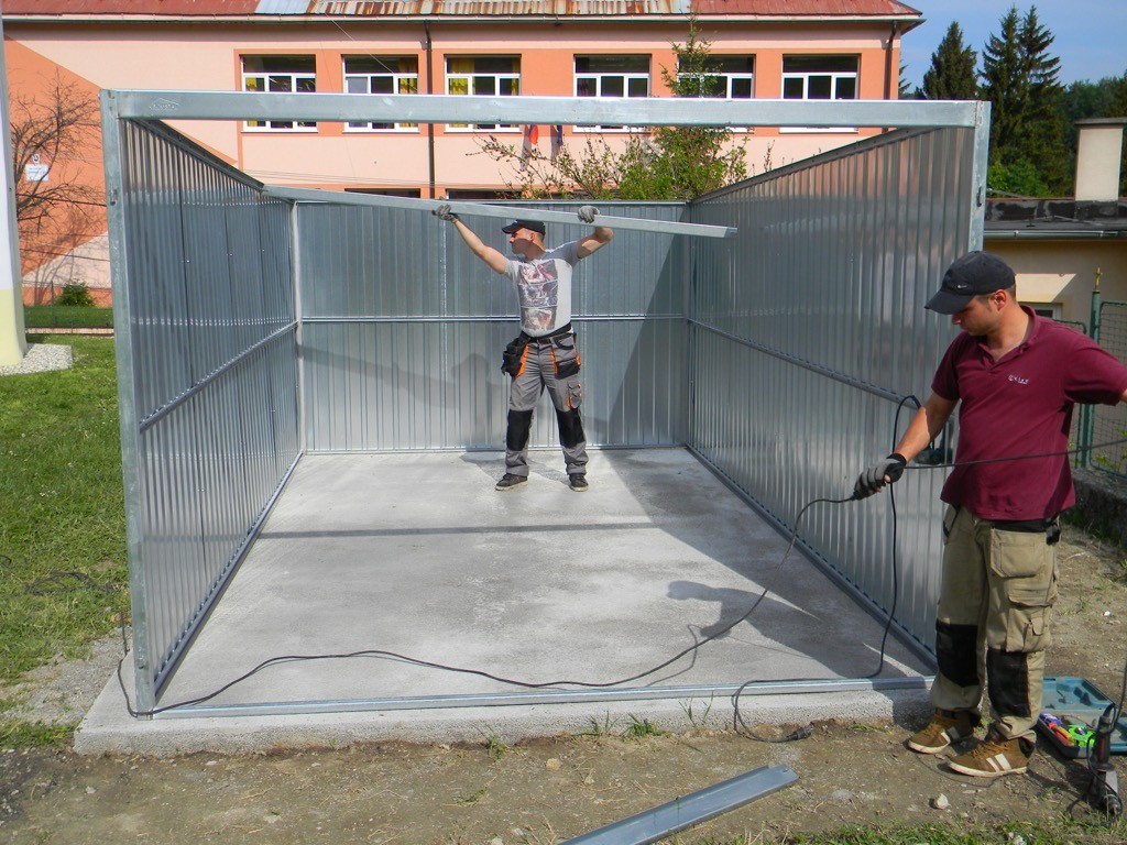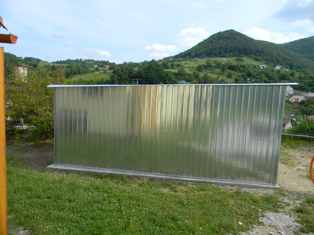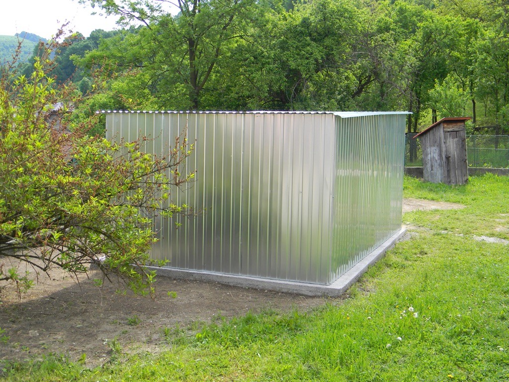 1.6.2015 nám namontovali na náš vopred pripravený betónový základ plechovú búdu – sklad peliet.